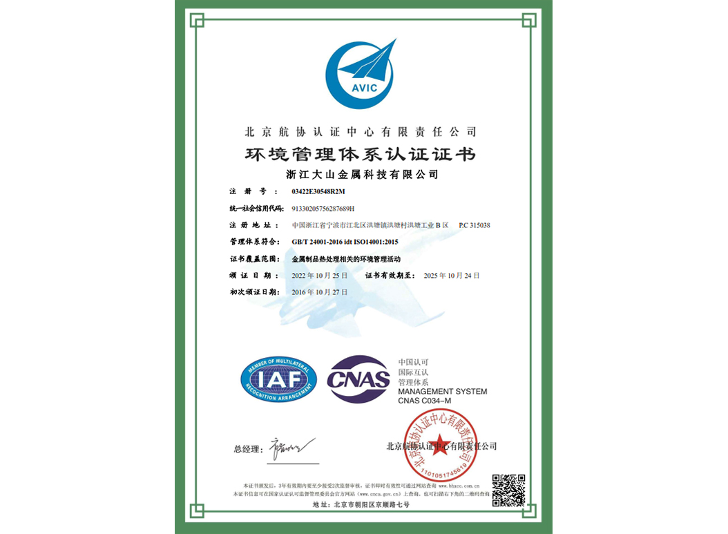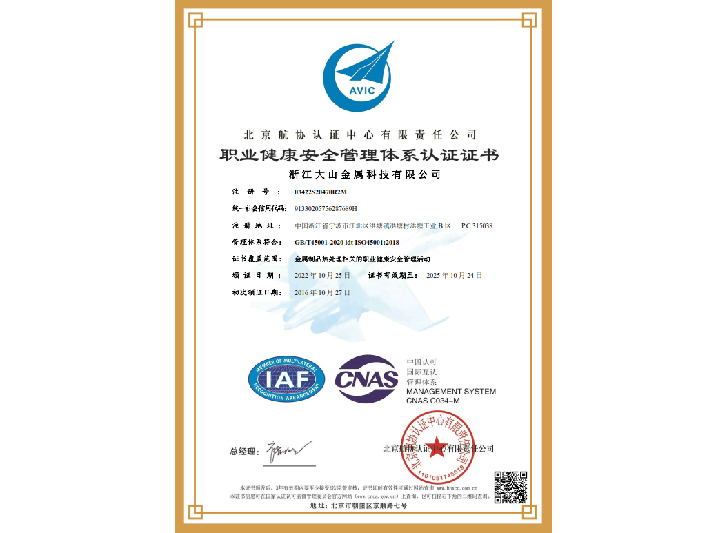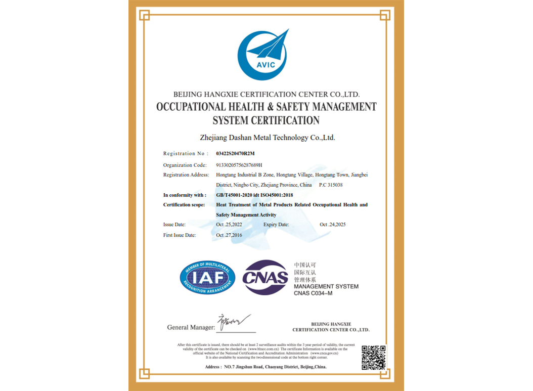 經過近35年來不斷引進先進的熱處理設備和技術,使企業具備了雄厚的產品熱處理工藝開發和生產能力,在熱處理行業中取得了令人矚目的業績,在客戶中建立了良好的口碑。本企業已通過IATF 16949:2016 質量管理體系、GB/T24001-2016 idt ISO14001:2015 環境管理體系、ISO 45001:2018 職業健康安全管理體系認證,正全面貫徹執行相關管理體系標準,為客戶提供更有保證的全面服務。大山愿與各界朋友攜手共進,為提高熱處理質量不斷努力!